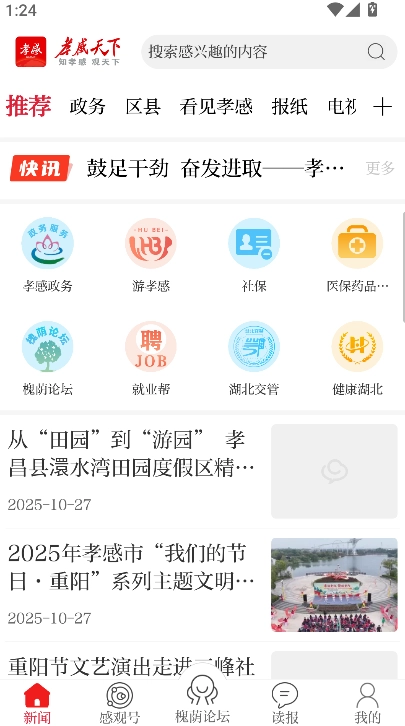 进入首页后,您可以浏览“孝感快讯”板块,获取本地最新的新闻资讯和社会动态,同时也能及时了解与孝文化相关的重要信息。