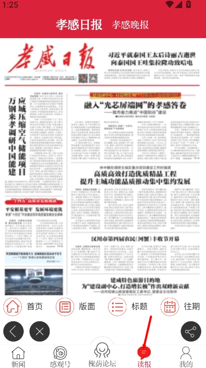 点击“读报”功能后,即可进入《孝感日报》的阅读页面,在这里能够浏览当期电子报的内容,从而获取权威信息以及地方报道。