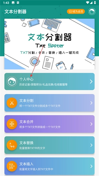 1、打开文本分割器,点击个人中心,进入功能页面。