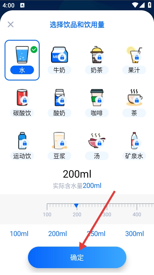 在【选择饮品和饮用量】界面,先选定饮品,接着设置对应的饮用量,最后点击【确定】按钮,即可完成此次记录。