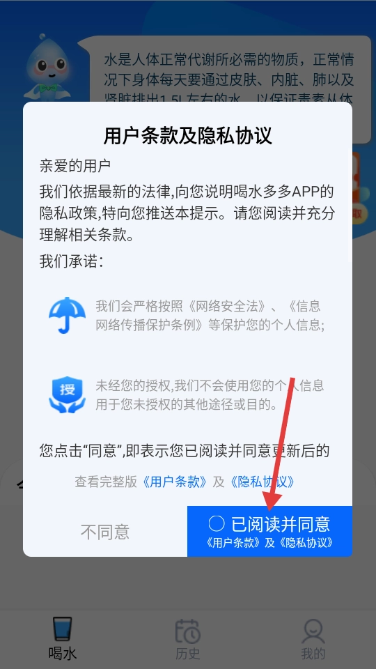 首次使用软件时,需点击【已阅读并同意】按钮以确认同意《用户条款》和《隐私协议》,之后才能进入软件。