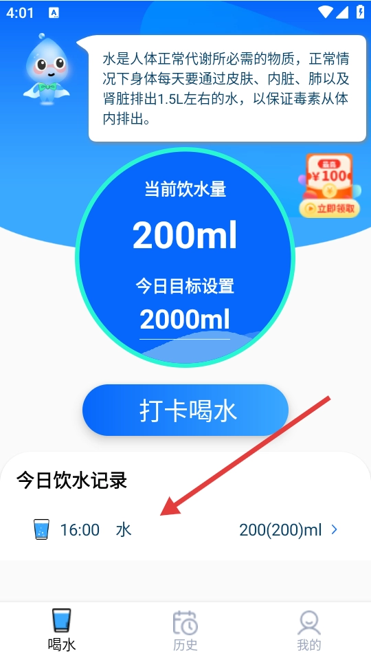 进入主界面后,点击【打卡喝水】按钮,即可开始记录饮水情况。