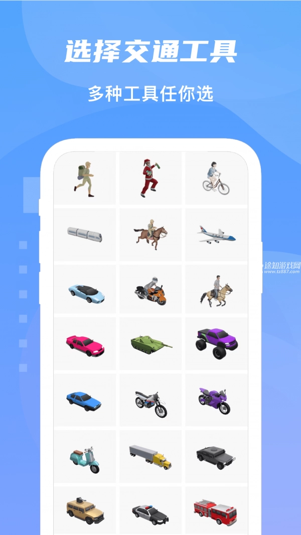 在旅行过程中,你能够自由挑选出行所使用的交通工具,这里有数十款3D交通模型可供你选择。