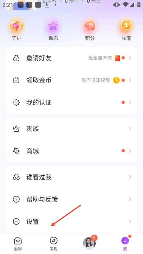 1、登录爱聊交友软件后进入【我】页面中点击【设置】