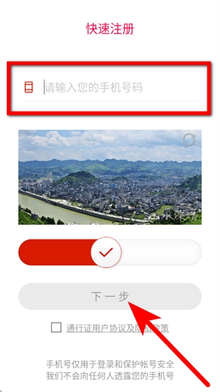 在注册界面,填写手机号码,勾选对应的协议,然后点击下一步按钮。