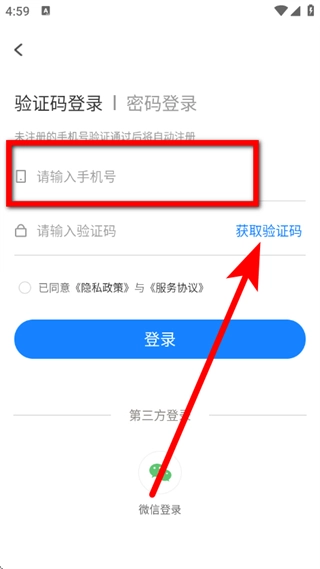 在验证码登录页面,输入手机号,点击获取验证码。