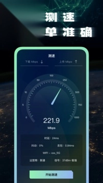 1、一键测速:查看手机网速,2G、3G、4G、5G、Wifi都可使用;