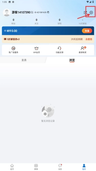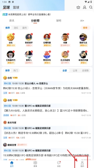 打开体育资讯类应用,点击底部“我的”选项,进入个人中心页面。
