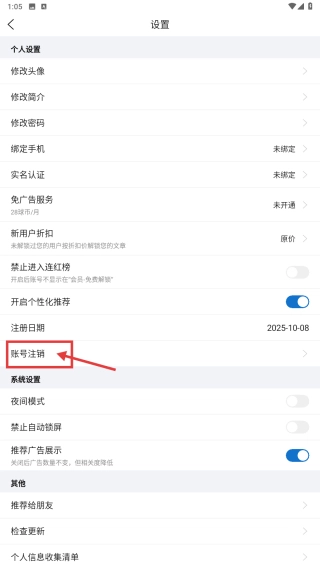 在设置界面中,找到并点击账号注销选项,即可进入账号注销的专门页面。