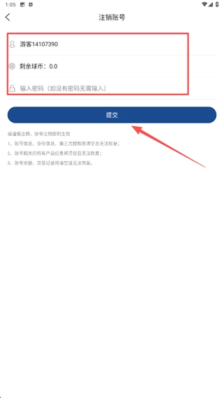确认账号信息无误后,输入密码(若未设置密码可直接跳过此步骤),随后点击提交按钮,即可完成账号注销流程。