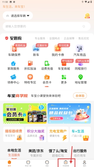 打开生活服务类应用后,点击底部菜单栏中的“优选商城”选项,即可进入优选商城的页面。