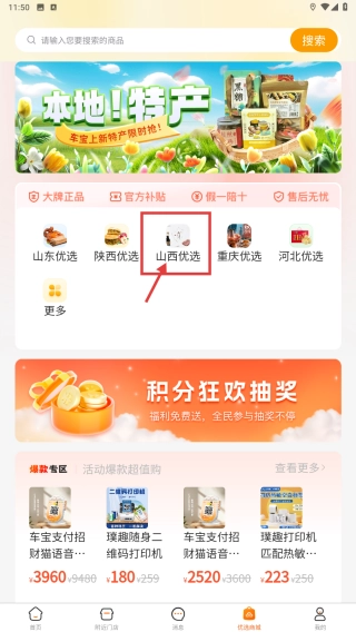 在优选商城页面,点击山西优选分类,浏览山西特产商品列表。