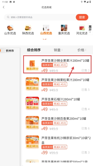 在山西优选的分类板块里,定位到想要找的商品“芦荟圣果沙棘全果果汁”,然后点击进入该商品的详情页面。
