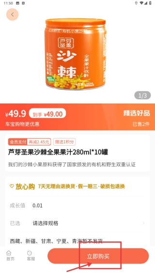 在商品详情页面,点击“立即购买”按钮,即可开展商品购买流程。