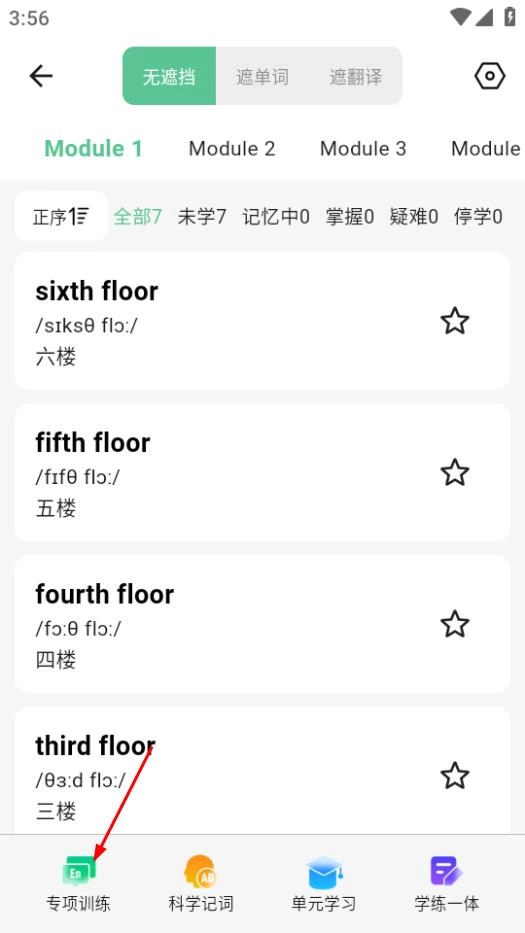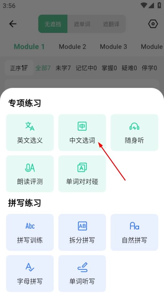 在单元单词学习页面,点击专项训练按钮后,会弹出专项练习的相关选项。