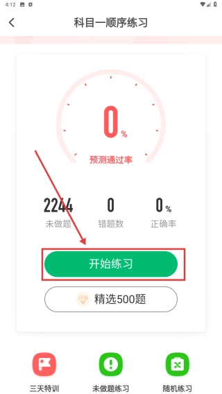 在科目一顺序练习页面,点击“开始练习”按钮,即可进入题目作答环节,通过逐步刷题来备考。