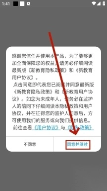先安装新教育学生端,安装完成后打开它;接着点击“同意并继续”按钮,同时确认同意隐私政策。