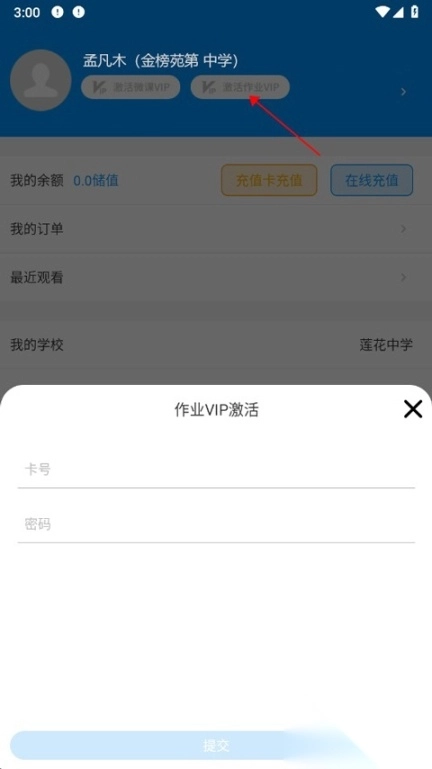 请先打开新教育学生端并完成登录操作,接着进入“我的”页面,找到页面顶部的“激活作业VIP”按钮(即下图中红色箭头指向的区域)并点击。此时页面底部会弹出一个对话框,在该对话框内输入老师提供的卡号和密码即可。