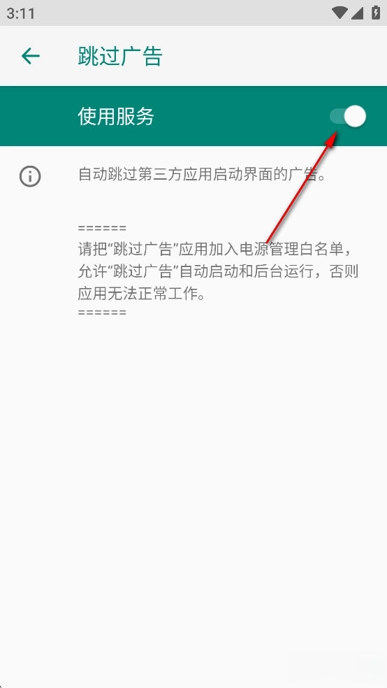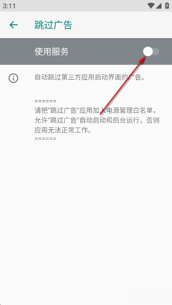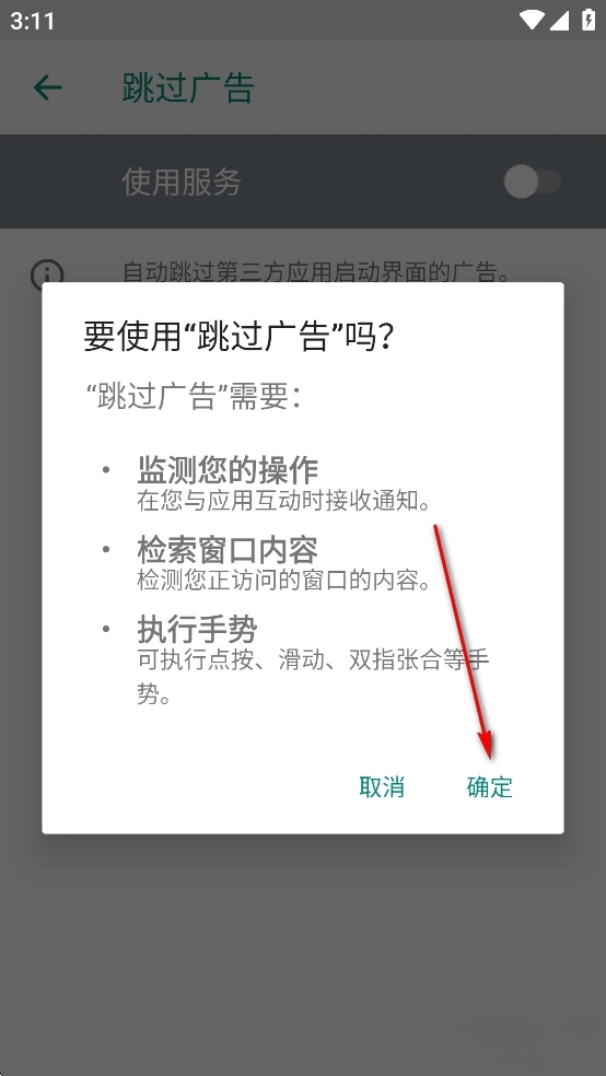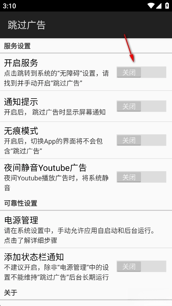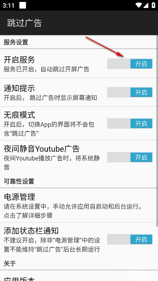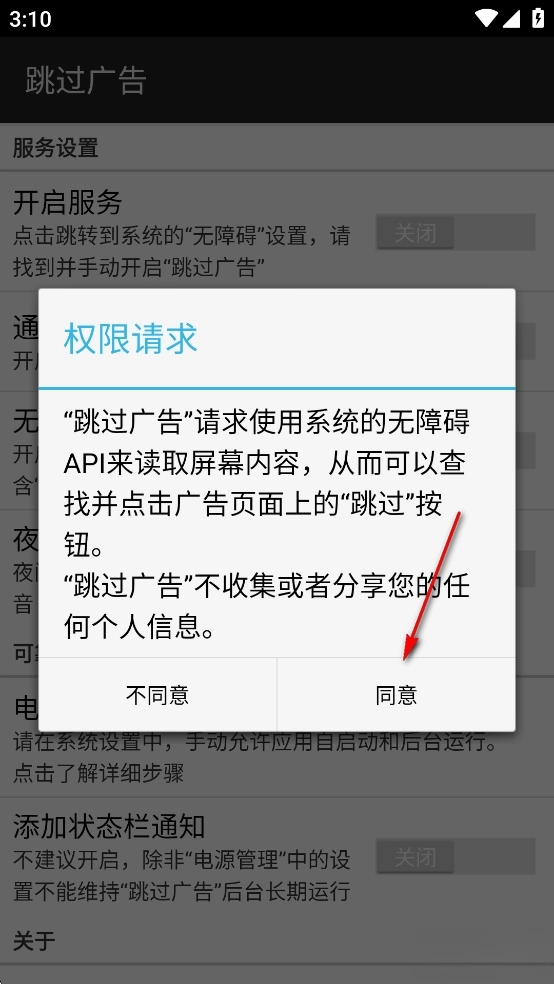 请务必在系统设置里开启相关权限,同时允许“跳过广告”功能自动启动和在后台运行,不然应用可能无法正常使用。
