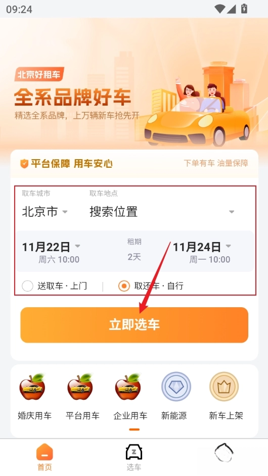 进入软件设定好位置、日期信息,点立即选车