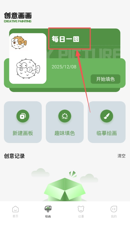 核心创作功能都在首页:“每日一图”是限时任务,“新建画板”是自由创作空间,“临摹绘画”适合用来练习基础,你可以根据自己当下的心情来选择。