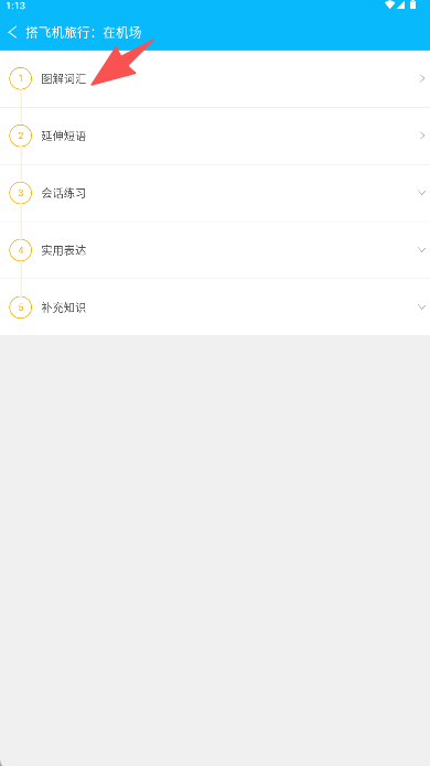 1、在首页选择Chapter 1“搭飞机旅行:在机场”这一章节,即可进入对应的学习页面。