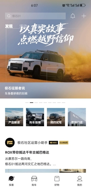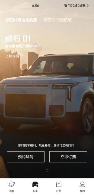 进入软件的探索页面后,你可以使用产品解读、购车指南、预约试驾等功能。