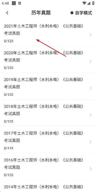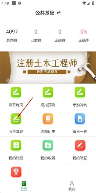 1、在公共基础题库首页点击“历年真题”选项,即可进入历年真题列表页面。