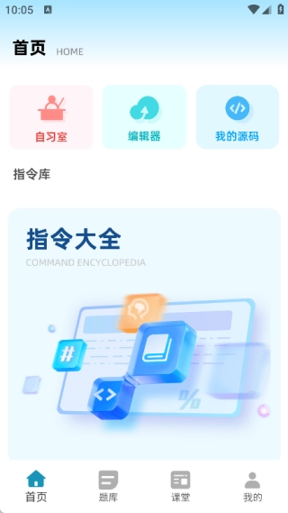 首页包含自习室、编辑器、我的源码功能,以及指令大全。