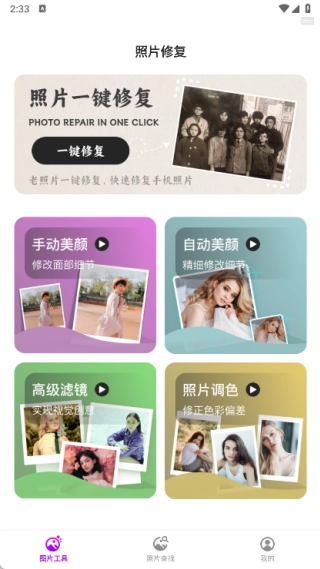 在图片工具里,你可以找到图片一键修复、手动美颜、自动美颜、高级滤镜、照片调色等功能。