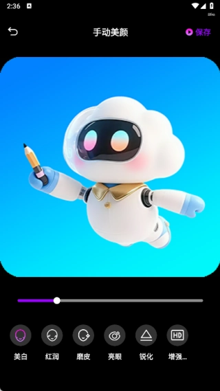 在手动美颜界面挑选要进行美颜处理的照片,接着尝试美白、红润肤色、磨皮柔肤、亮眼提亮、细节锐化等各项功能。