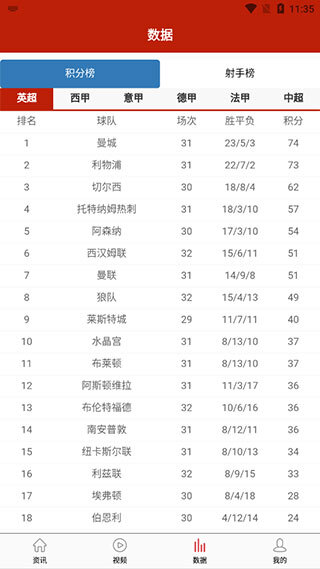 3、在数据页面,既能查看每支球队的基本数据,也能查看积分榜上的数据
