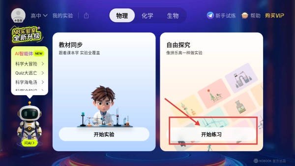 进入NB实验室的物理界面后,点击自由探究板块中的开始练习按钮,即可进入实验室选择页面。