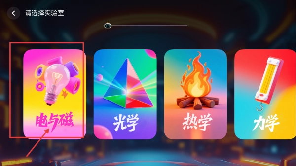 在实验室选择页面,点击“电与磁实验室”选项,即可进入对应的实验分类界面。