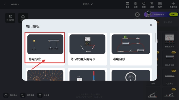 在电与磁实验界面中,找到热门模板板块里的静电感应模板并选中,随后启动实验练习环节。