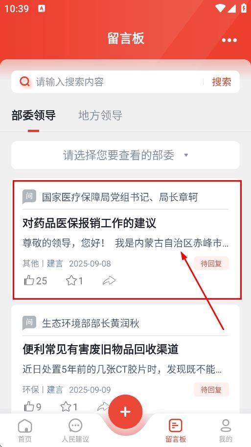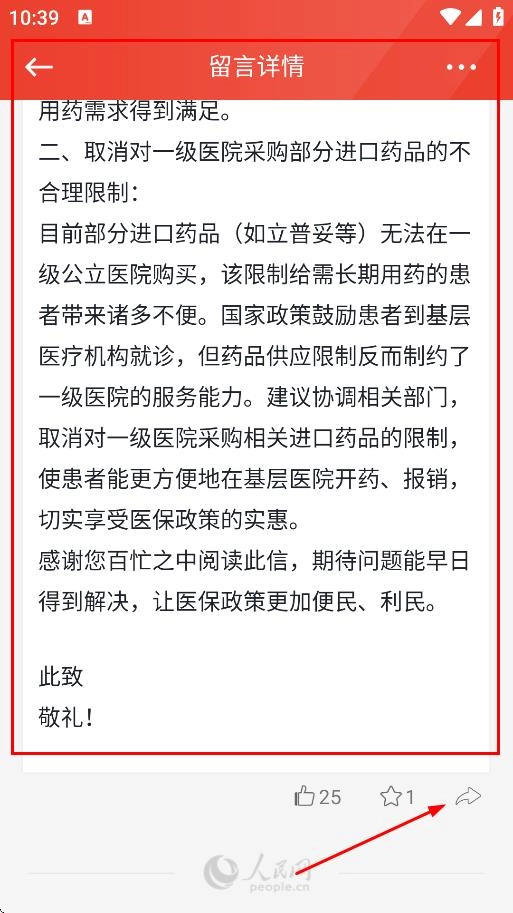 在留言板页面,挑选你想查看的留言,例如关于药品医保报销工作的建议。