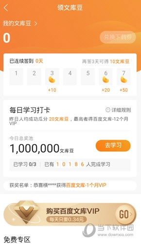 2、点击【签到】按钮即可完成签到,连续签到3天可获得10文库豆,连续签到6天可获得20文库豆,连续签到7天可获得50文库豆。