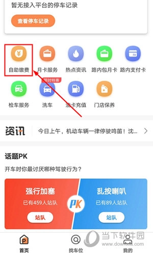 1、在美行停车首页的功能界面中,能看到“自助缴费”的功能选项,点击该选项就能进入。