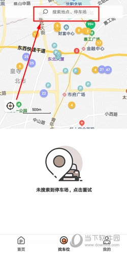 1、在“找车位”功能界面中,能看到当前所处的具体位置,可点击上方的搜索按钮,也能搜索附近区域。