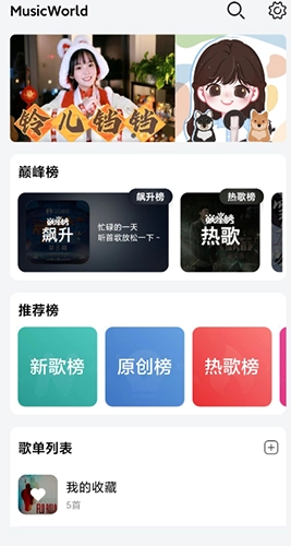 1、打开音乐世界之后可见其简洁的界面,这里有巅峰榜以及推荐榜单;