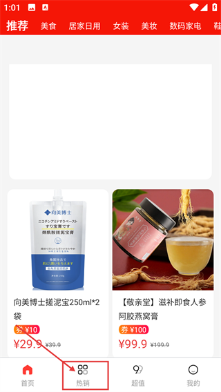 进入应用主界面后,顶部设有【美食】【居家日用】等分类标签,底部点击【热销】即可进入热销商品列表页面。