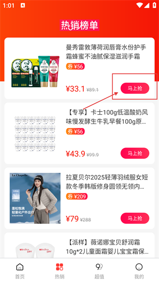 3、在【热销】页面能够查看【热销榜单】中的商品,每个商品旁边都设有【马上抢】按钮,点击该按钮就能进入对应商品的购买流程。