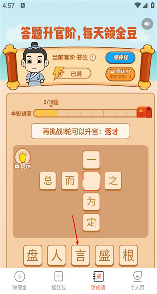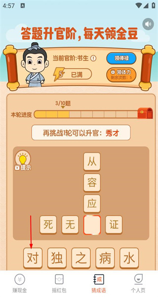 4、完成当前题目后,本轮已完成三题,总共十题,需要从下方选择正确的字填入对应的空格,继续进行挑战。