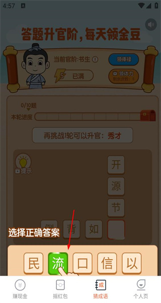打开软件进入答题界面后,本轮答题进度显示为0题完成、共10题,需要选择“流”字填入对应的空格,才能继续推进答题进程。