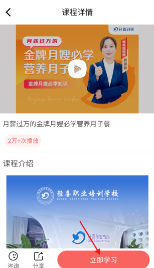 4、进入课程详情页面后,在确认好学习内容无误后,点击“立即学习”按钮,即可开启母婴护理知识的学习之旅。