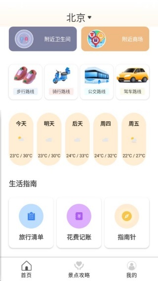 进入平台首页后,你可以快速获取附近卫生间和商场的信息,还能选择步行、骑行、公交或驾车路线;五天内的天气信息一键就能查看,生活指南也能让你轻松了解相关内容。