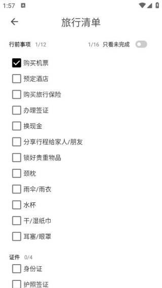 2、具备旅行清单记录功能,用户能够添加需携带的物品并进行管理,从而防止关键物品遗漏,确保旅行顺利开展。