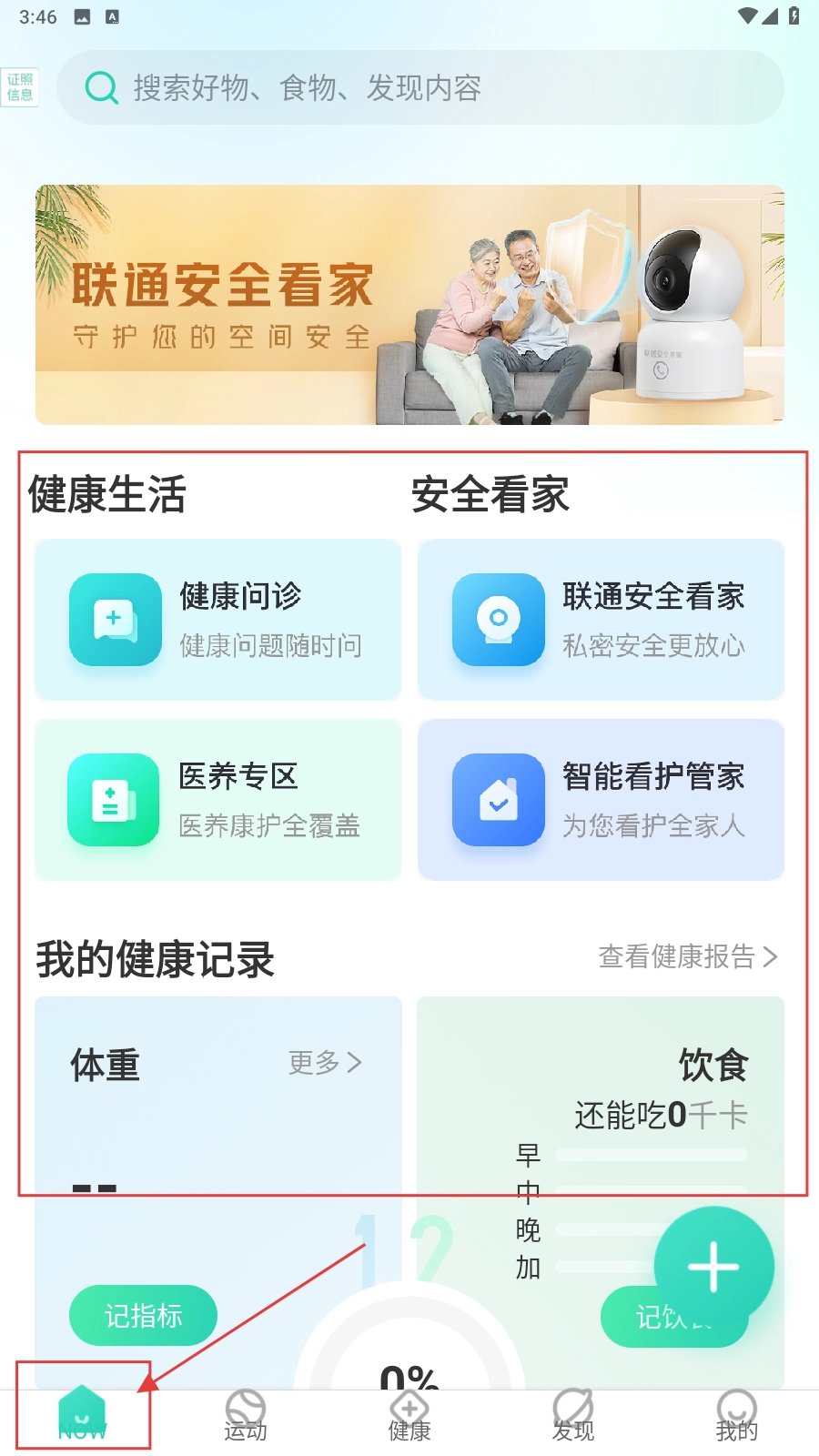 打开应用后,进入【NOW】页面,找到并点击健康生活和安全看家相关的功能区域(例如健康问诊、联通安全看家这类功能入口),接着就会进入到健康服务的选择操作环节。