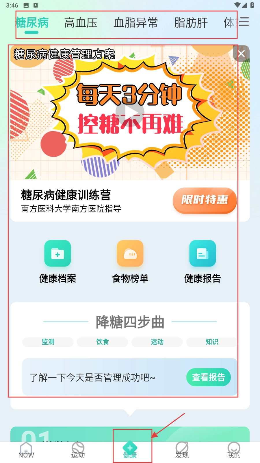进入【健康】板块,挑选疾病类别(如糖尿病、高血压等),查看健康管理方案,完成疾病健康管理内容的浏览任务。