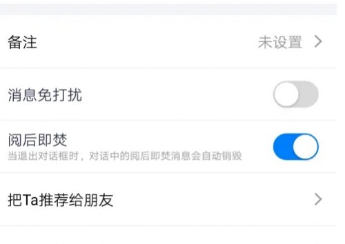 2、点击「阅后即焚」选项右侧的开关即可开启。